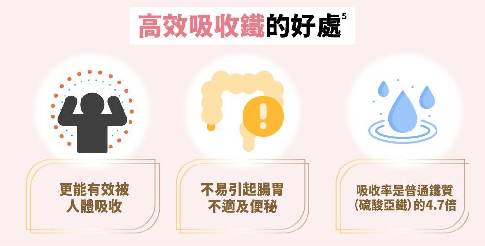 坊間很多孕媽誤解服食孕婦營養補充品會引致便秘,其實選擇含高效吸收鐵(甘胺酸亞鐵 Ferrous Bisglycinate)的孕婦營養補充品,相比普通鐵質(硫酸亞鐵Ferrous sulphate),更能有效被人體吸收,不易引起腸胃不適及便秘⁵。記得要小心選擇合適的孕婦營養補充品,以減低出現便秘等腸胃不適的機會!